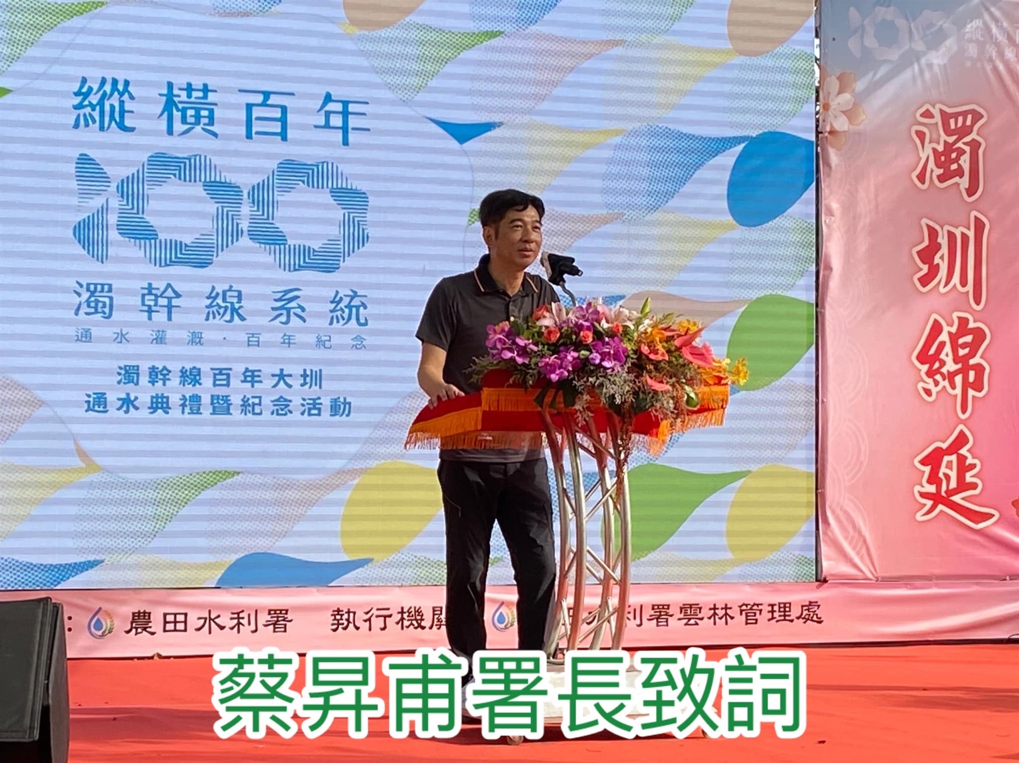 本署蔡昇甫署長於致詞時則表示:歡迎大家來參加今天濁幹線通水百年的紀念活動,百年前,雲林的灌溉水源貧乏,雖然濁水溪穿流而過,卻只能眼睜睜看著溪水川流入海。幸好,八田與一技師率領台日的水利工程人員,用了四年的時間,於1924年開通了濁幹線,改變了雲林的農業面貌,讓雲林的農田由原本的看天田,得能有一穩定的灌溉水源,豐富了物產,增加了人口,讓雲林逐步成為台灣的農業大縣。而這其實是一代接一代水利事業人員不斷的努力、守護,所獲致的成果。未來,農田水利事業人員,將運用最新的科技,來面對極端氣候變遷的挑戰!今天來到這裡的好朋友,都認同濁幹線貢獻,也因此今天安排了健走活動、祭祀典禮,通水典禮以及食農教育,農田水利文化教育等活動,希望能讓濁幹線長長久久,源遠流長!