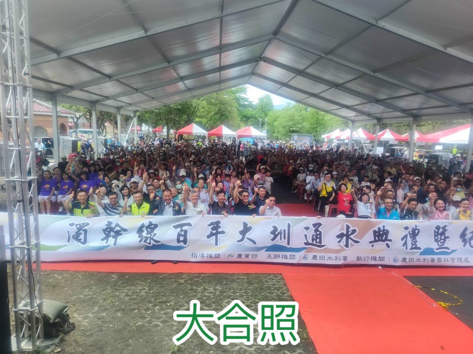 今天在本處農田水利環境教育園區,我們舉辦了「濁幹線百年大圳通水典禮暨紀念活動」 ,現場與會人士包括:農業部黃昭欽次長、雲林縣謝淑亞副縣長、立法院劉建國委員、農水署蔡昇甫署長、雲林管理處林國華處長、雲林農田水利會前會長林文瑞、雲林縣議員張維崢、陳芳盈,林內鄉劉姿言鄉長、元長鄉李明明鄉長、立法委員張嘉郡服務處秘書王秋信等嘉賓共同出席,以及1,500位民眾攜帶家眷熱情參與。