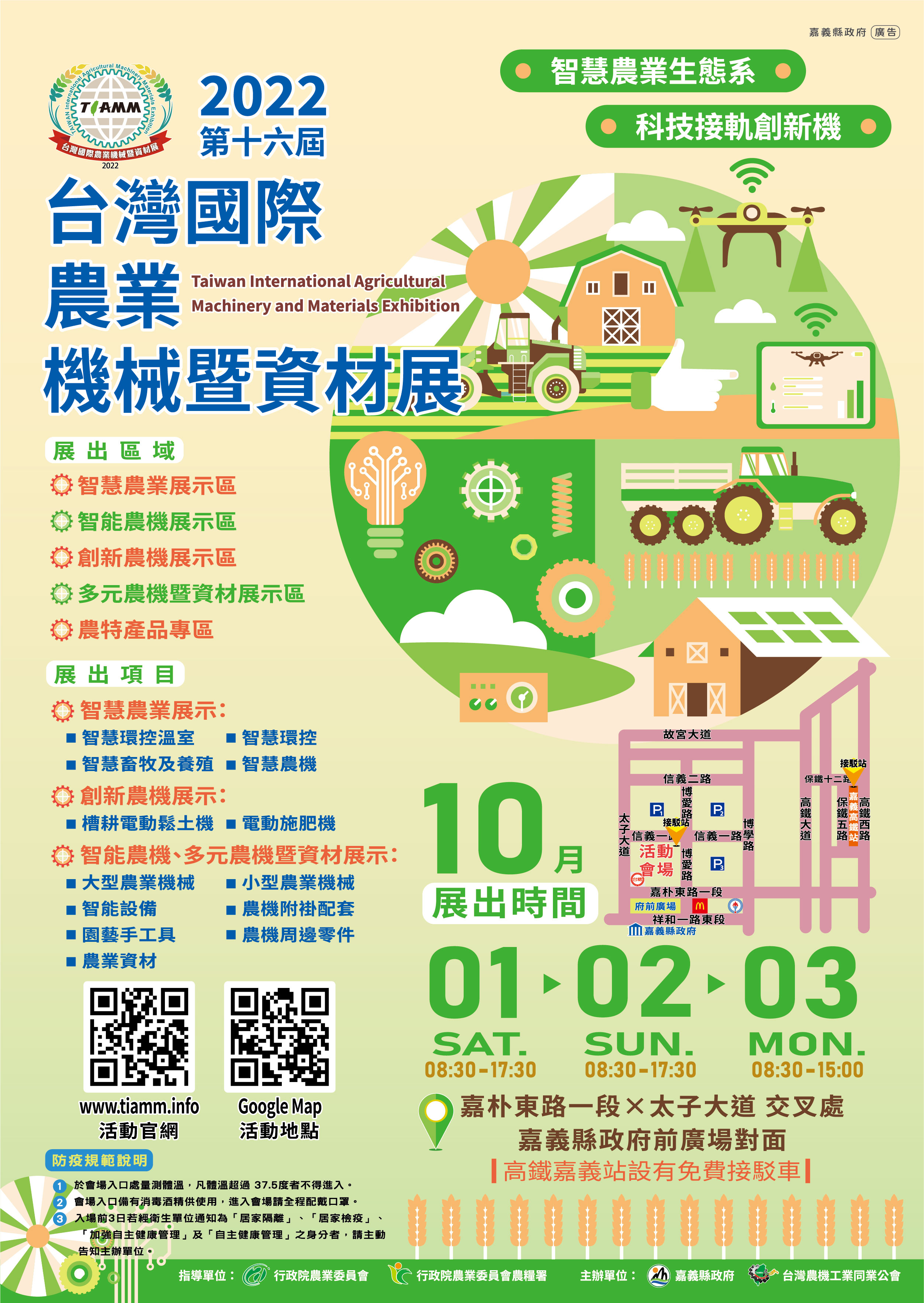 111年10月1日至3日嘉義縣政府舉辦「2022第十六屆台灣國際農業機械暨資材展」,歡迎踴躍參加